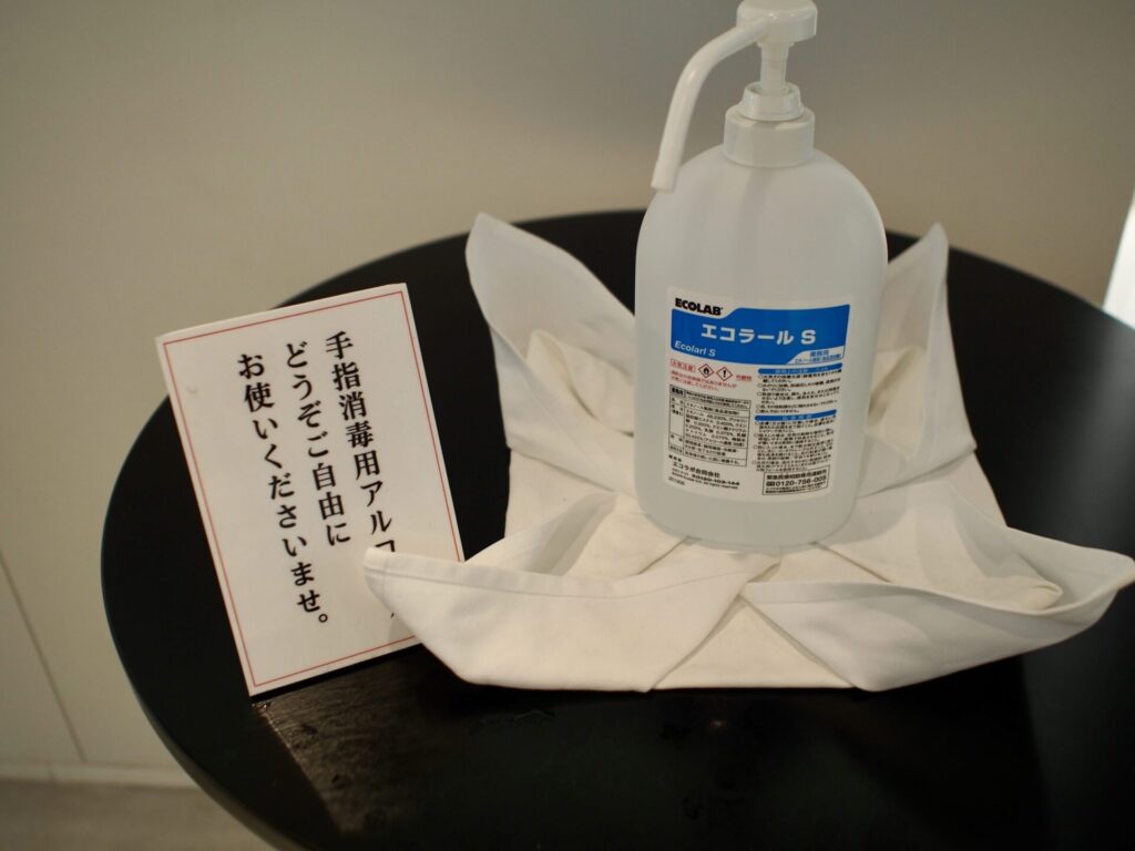 エントランスを入ったところに 新型コロナウイルス対策として アルコールの手指消毒薬が置いてありました。