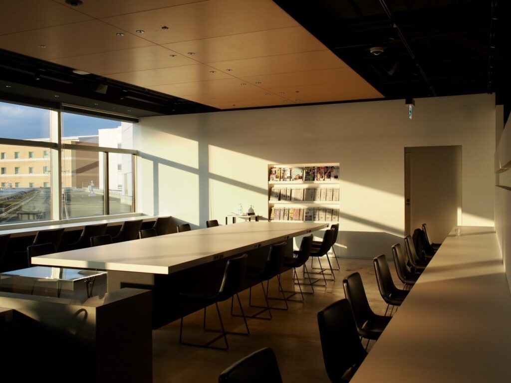 朝焼けが差し込む シンプルで洗練されたラウンジです。