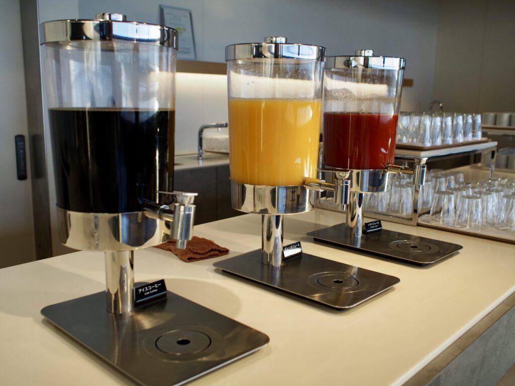 左から アイスコーヒー/オレンジジュース/トマトジュースが並んでいます。