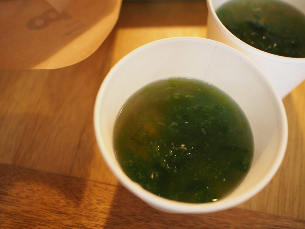 アーサ汁とは アオサ+鰹出汁のスープです。ポーたまには おにぎりだけしか置いていないかと思っていたので 朝から温かいスープをオーダーできるのは とても嬉しかったです。