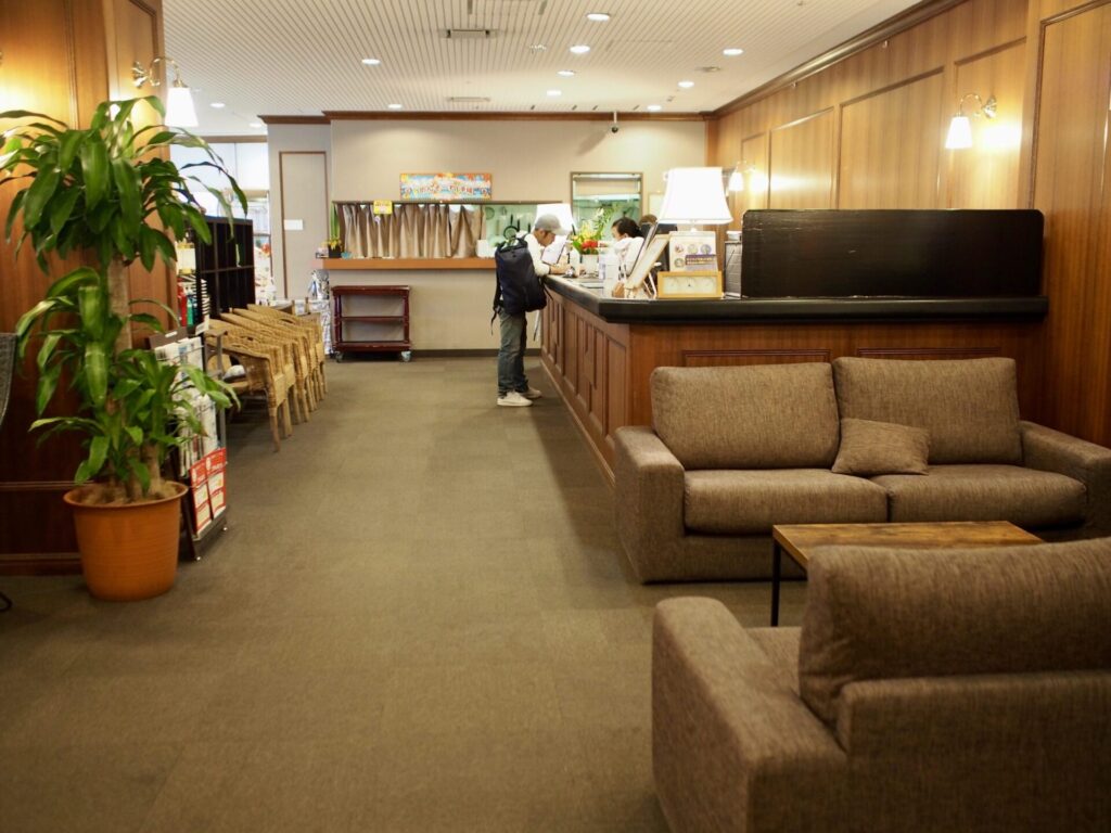 右がチェックインカウンター 左は朝食が食べられるスペースです。